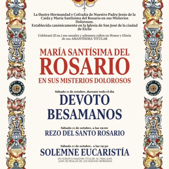 Con motivo de la Festividad Litúrgica de María Santísima del Rosario la Hermandad celebrará (D.m) el próximo sábado, 11 de octubre, los siguientes